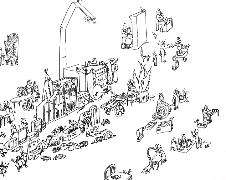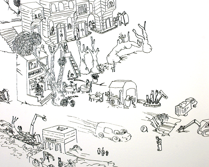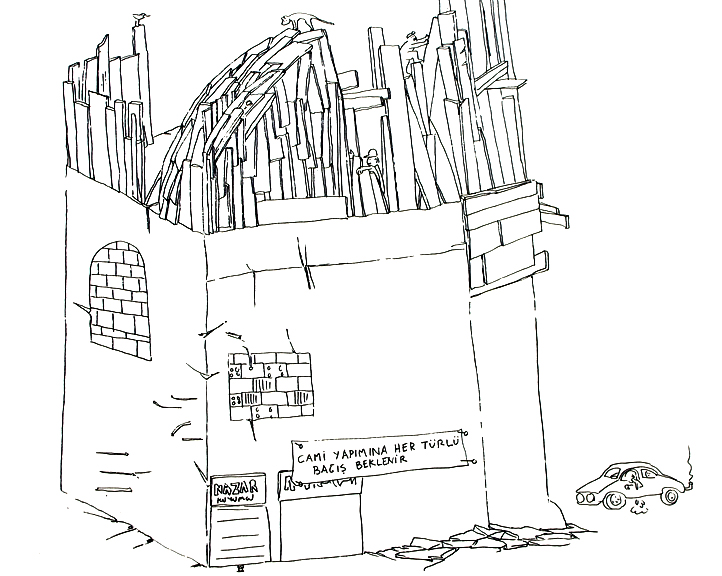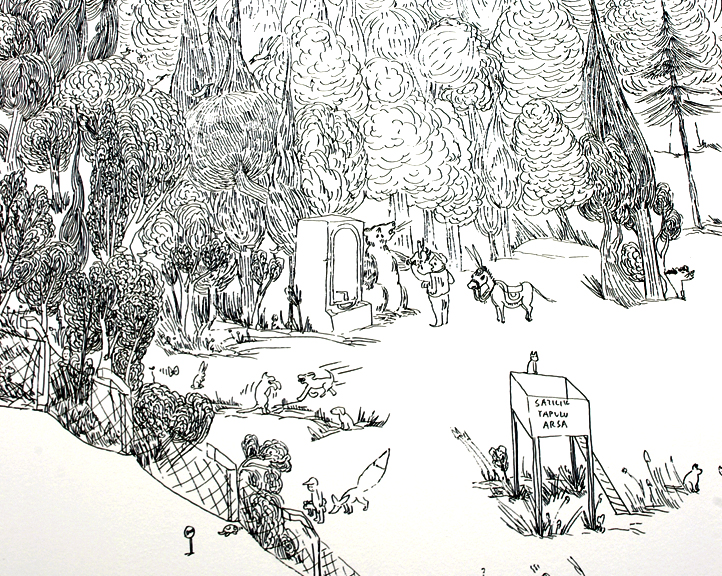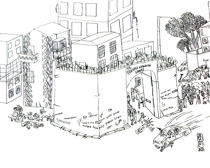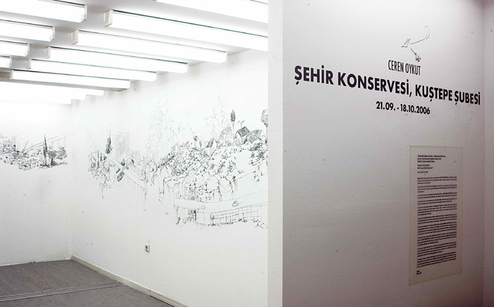 City Can is dealing with Istanbul as a city of dreams and nightmares. It goes beyond traditional drawing by extending the picture into space. The work surrounds the spectator. It shows a heterogeneous urban cosmos, in which millions of stories can be observed. Instead of being a wall-drawing, the work is a space-drawing, a time and site-spesific installation. Ceren Oykut transfers the classic medium into contemporary forms in order to adjust the act of drawing to today’s reality. She poses the eyes of a child combined with the mind of a scientist. The artist researches Istanbul and reveals the stories of the city dwellers living within the chaos and absurdity of everyday life. Ceren Oykut belongs to this city, is an active part of it. City Can functions like a subjective archive, a visual pool of the streets of Istanbul. The artist draws what she sees. The result is an all over composition, a complex structure without any focus. Like the city itself, there is no centre in Oykut’s work. She creates an individual map, in which details are more important than a general impression, a picturesque wiew or any tourist attraction.Turkis Miniature as well as caricature, satire and humour in general (mizah) have evident influences on her work. On the walls of Under Construction, she individually reproduces her direct surrounding, the urban context she lives in. Though, different from real life, in Oykut’s work, everything and every being have same formal and conceptual importance. The freedom of miniature is adjusted to the freedom of the mind.City Can translocates parts of Istanbul into Under Constuction. In the installation, the spectator sees scenes that Ceren Oykut watched on her way from Boyacıköy, over Başiktaş, the Bosphorus, Kadıköy to Under Construction in Maltepe during the installation’s production time of three weeks. The work is like a record of seen incidents, which she saved in her memory and later drew on the wall. She took various ways to the exhibition space to see as many different stories as possible. The result of this research is a compressen image of Istanbul. There, everything is in a state of permanent flux. The city, the construction site and Oykut’s installation are constantly developing. Together they form one liquid composition. İt resembles a concert, in which the sound of Istanbul gets created: The machines of the construction site form the rhythm, and the pencil dances an the walls to the melody of the city.In City Can, time and space stop existing. The spectator steps out of real life in order to discover Istanbul. Therefore, Oykut’s work shows one of art’s basic functions:Art becomes an instrument for researching and questioning society by forming parallel realities which represents models of our world. In her installation, we see our city through the eyes of somebody who is observing from a differet angle.Ceren Oykut’s work reflects the paradox of being a distant observer and individual activist. City Can gives us a feedback. What we see is what we live with. The spectator is wellcomed to enter the installation in order to discover various faces of Istanbul, this beautiful monster. Istanbul is more than an accumulation of concrete, steel and glass. Istanbul is made by its inhabitants. We create Istanbul everyday new…