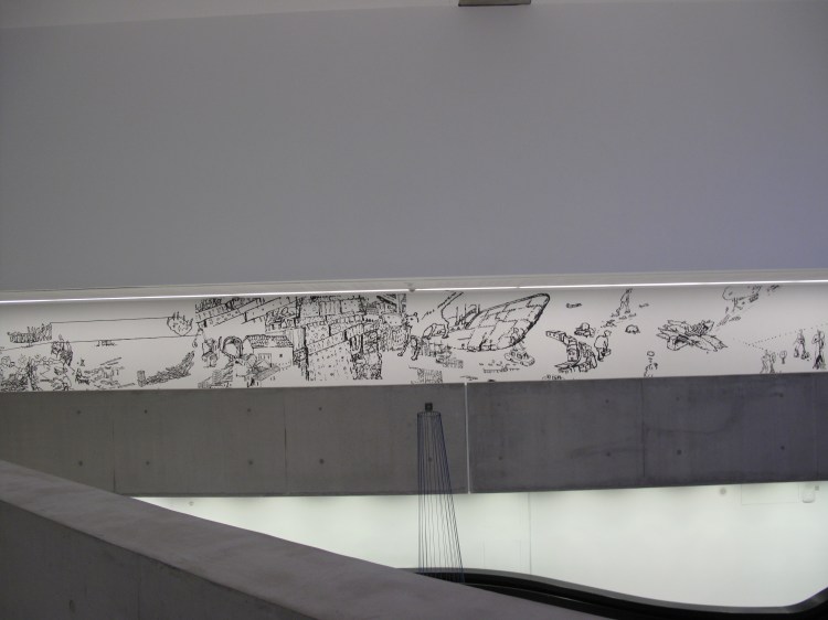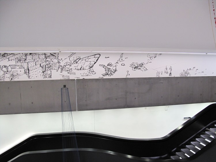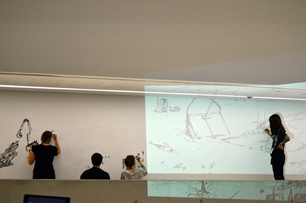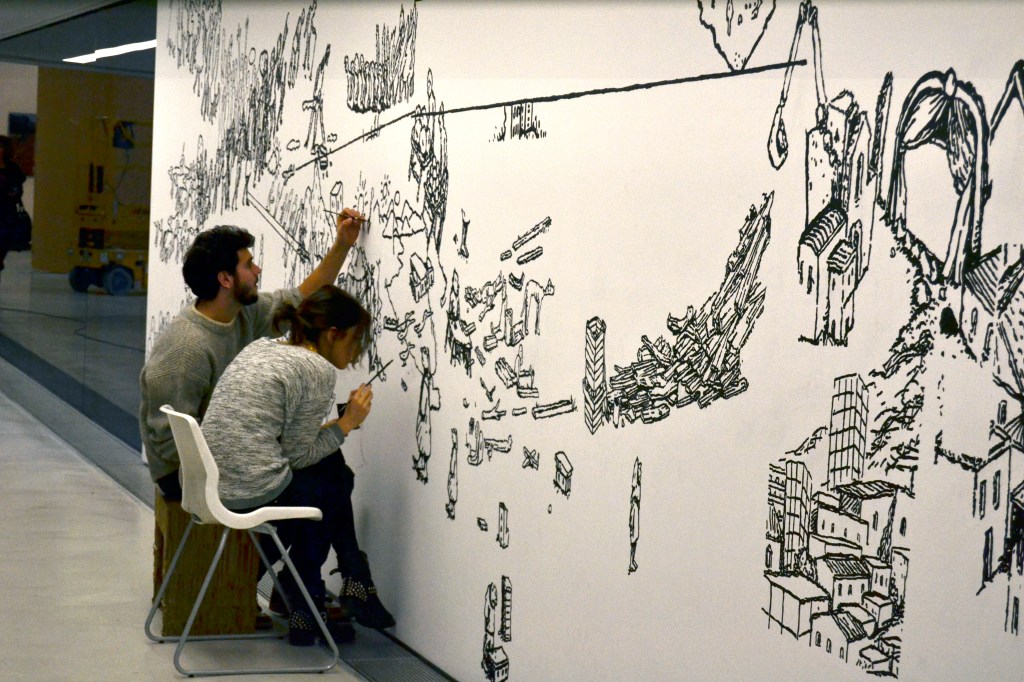 A mural and a site-specific installation commissioned by MAXXI, is actually a workspace setting up a collection of short daily stories. Oykut composes, decomposes and sometimes overlaps her drawings, which are taken from small size papers. They appear and disappear along the exhibition space. Panning the picked details of daily moments, she connects Istanbul and Rome in a communal space.