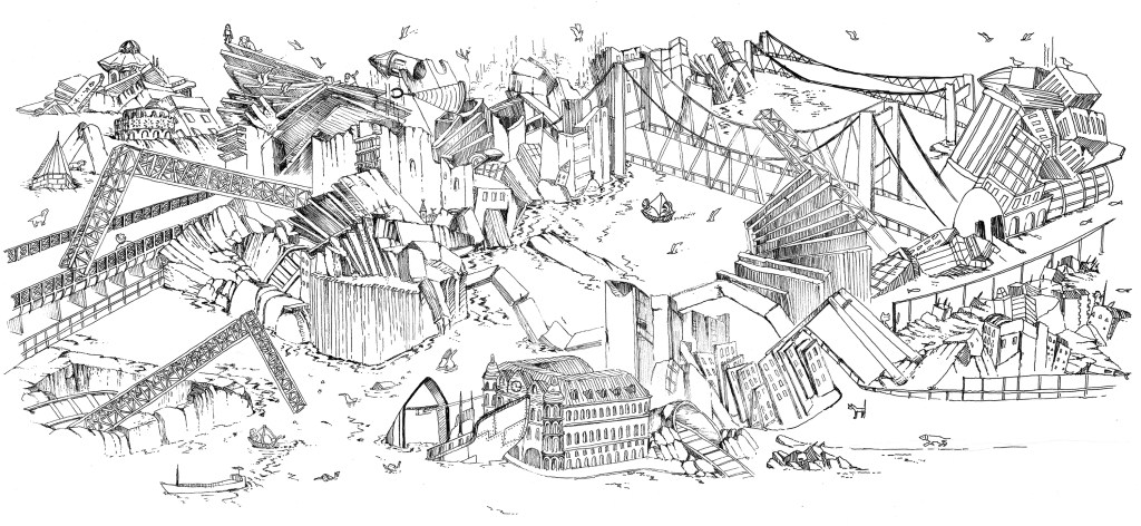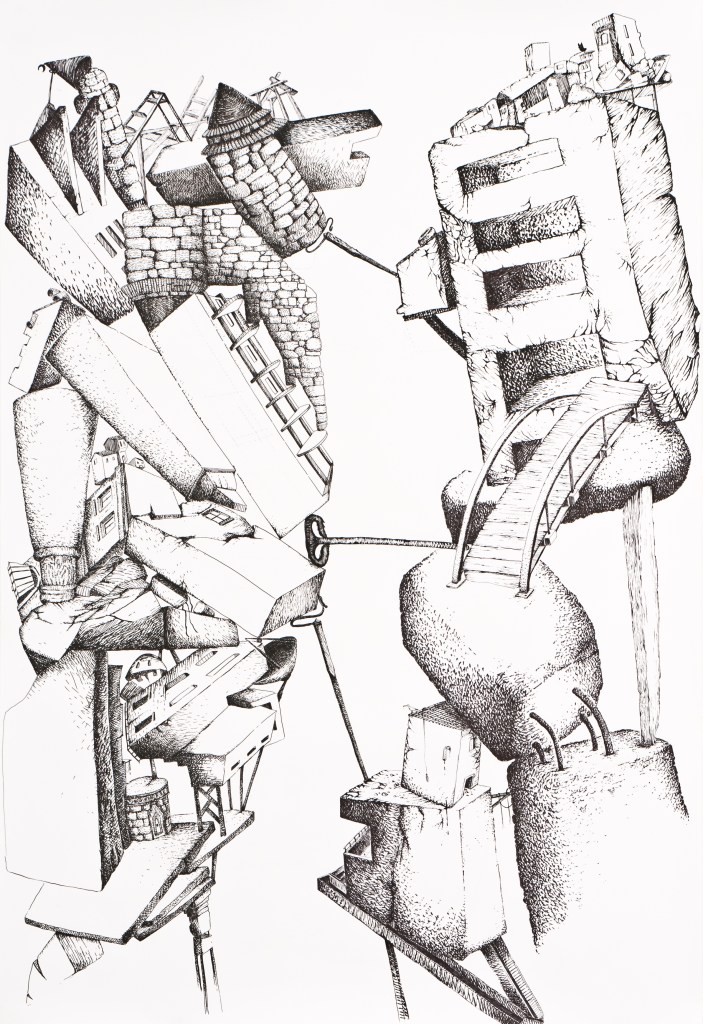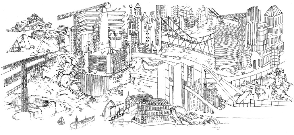 Buildings: Sand, gravel, iron, brick, briquette, cement, plaster, limestone, timber, roof tile, glass, tar…People: Oxygen, carbon, hydrogen, nitrogen, calcium, phosphate, potassium, sulfur, sodium, magnesium…Are people more exhausted or buildings? Buildings spoke: “Go back to caves, the city is finished!” People did not speak, but took on the forms of buildings, embraced stone and concrete, sprawled out, slept, woke up, hid… Buildings leaned over, twisted, straightened up, constantly grew. They don’t dance. They don’t move. Everyone has a sleeping space but no one has a place in which to hide. ///////// Binalar: Kum, çakıl, beton, alçı, kireç, kereste, kiremit, cam, katran..İnsanlar: Oksijen, karbon, hidrojen, nitrojen, kalsiyum, fosfor, potasyum, kükürt, sodyum, magnezyum..İnsanlar mı daha yorgun, yoksa binalar mı? Binalar dile geldi: “Mağaralara geri dönün, şehir bitti!”İnsanlar konuşmadı, binaların şeklini aldı, taşa, betona kollarını doladı, boşluklara yayıldı, uyudu, uyandı, saklandı… Binalar eğildi, büküldü, doğruldu, habire büyüdü. Dans etmiyorlar. Kımıldamıyorlar. Herkesin yatacak yeri var, ama kimsenin kaçacak yeri yok.