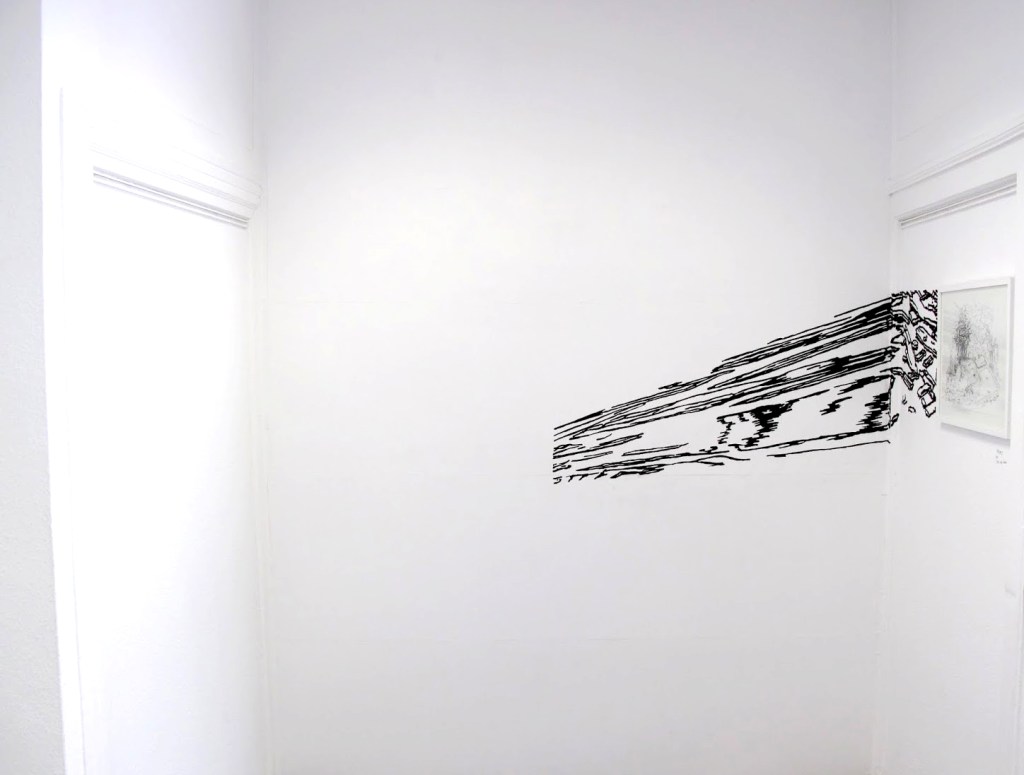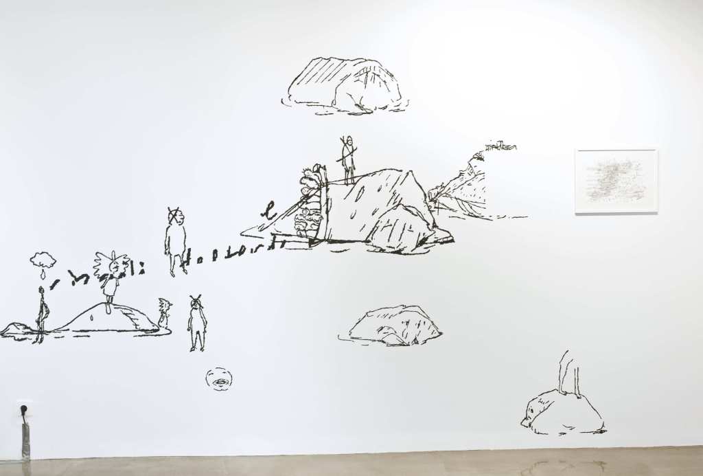 view from the exhibition Tarlada Yüzenler (Swimmers In The Field), acrylic on wall, four framed drawings (ink on paper, 28x38cm) x-ist, 2016, Istanbul Photography: Mesut Güvenli