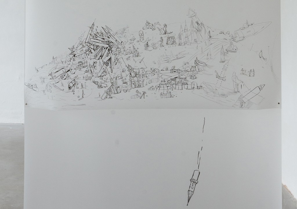The inhabitants of Istanbul sometimes have to share their living spaces with a minaret. There is a minaret located in line with the windows of Ceren Oykut’s studio in Istanbul. The fact that Polistar, the exhibition venue, also shared the same fate with Oykut’s studio, inspired this work. In her work called Minaret, Ceren Oykut dreams of a planet (limbo/inferno/paradiso) where minarets gather and shout, faint and sober up. And this planet is located on the bottom of a long rolling paper. (In memory of Turhan Selçuk who wrote and drew the Marvellous Adventures of Abdülcanbaz, where the minarets were spacecrafts and flew deep into the space.)