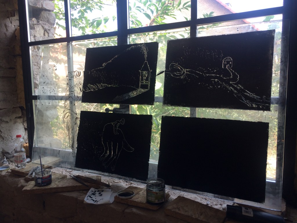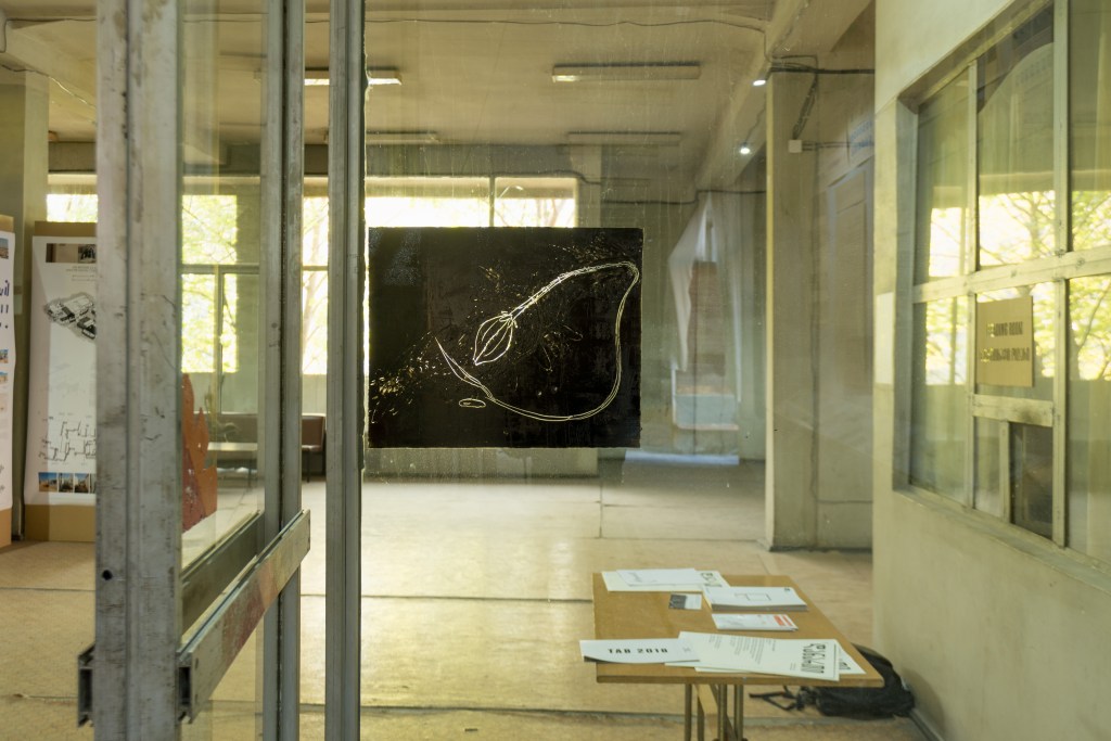 Topography Man, work process, block paint on the windows , Built Temporality exhibition curated by Sophia Tabatadze & Tinatin Gurgenidze.Former KGB building, Ghildani, Tbilisi, Georgia, October 2018. Fotographs by Sandro Sulaberidze. Oykut has made drawings directly on the glass windows in the exhibition space. As a second step, she photographed these images and animated them. The animation is projected on the same glass windows, where the drawings are.