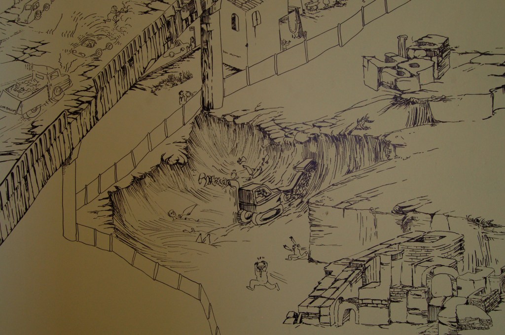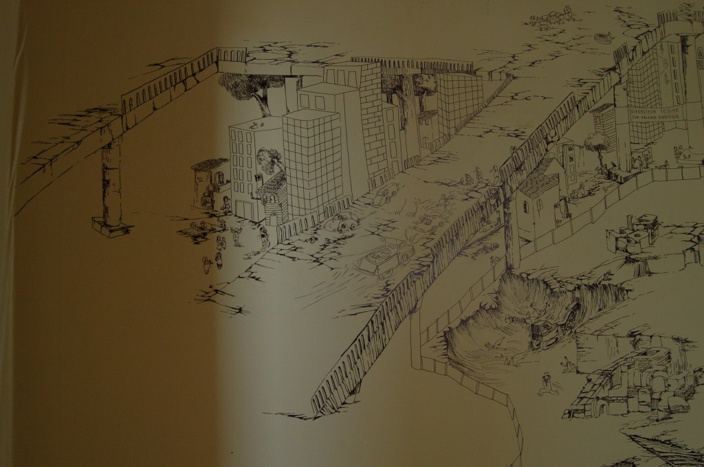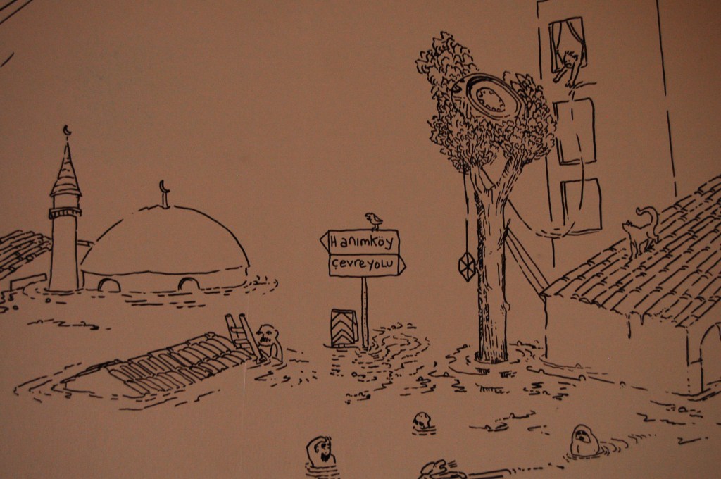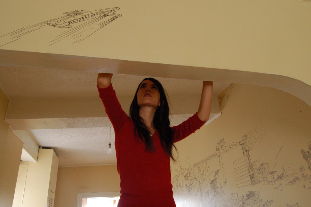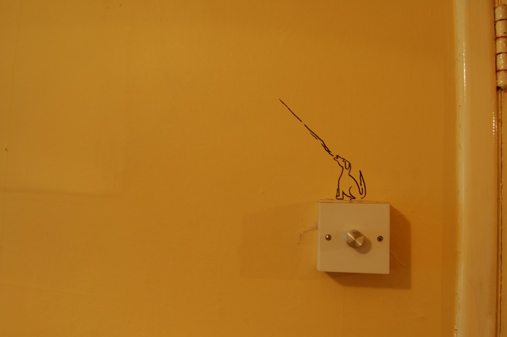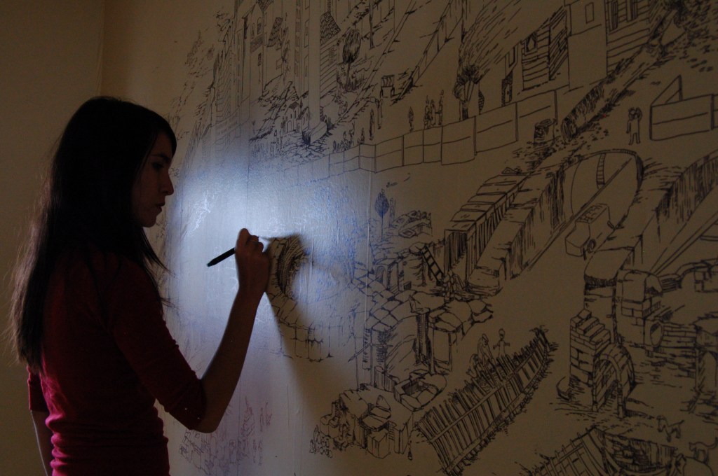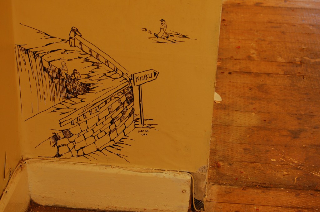 Ceren Oykut’s site-specific drawing work takes place on the inside walls of an empty domestic dwelling in Shandon. Oykut’s drawings has the characteristic of a diary that takes its source of inspiration from the subtle details in the dailylife of Istanbul, its continuous flux, contradictions and chaos. Istanbul provides invaluable possibilities for seeing and observing by tying together various cultures, different types of people, ways of thinking and interaction with the city. Through her observations, Oykut tries to reveal the social, political and cultural texture of the environment she is living in. Her main icons are always from the streets and represent the excluded people, such as the paper collectors, glue sniffers, unemployeds, street animals, street vendors, etc., which represent not only a poverty but a richness in the natural flow of life. Her work in Shandon is an attempt of overcoming the difficulties of drawing in another city that has totally different rhythm and order of daily life, as well as a meditation on the clash of different experiences in her hometown Istanbul and Cork.