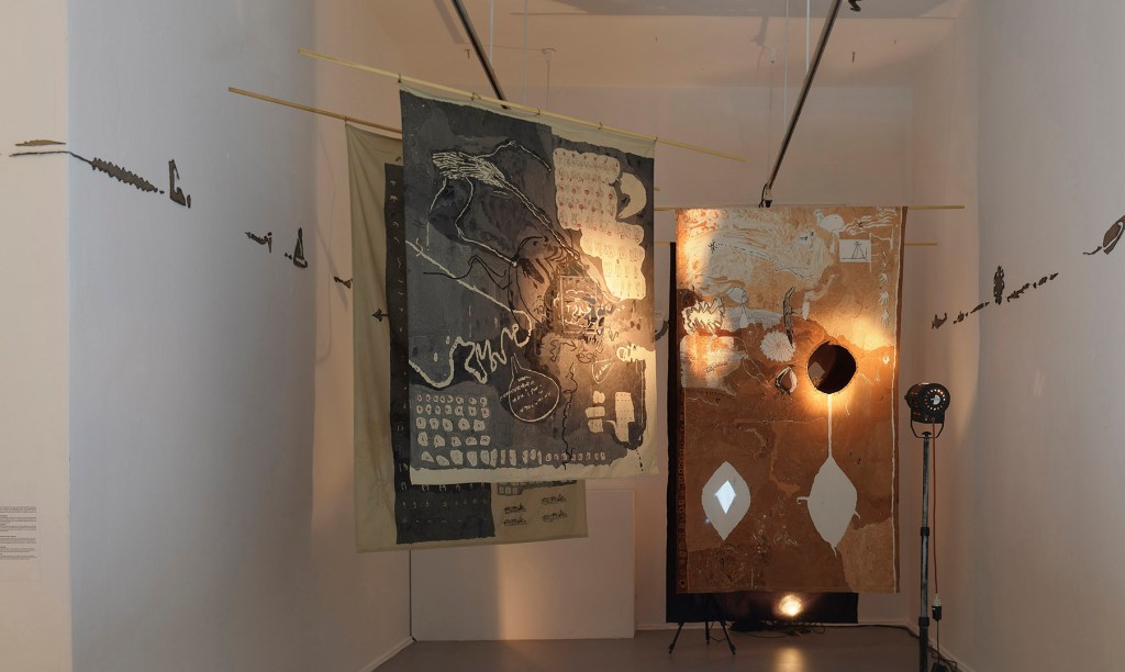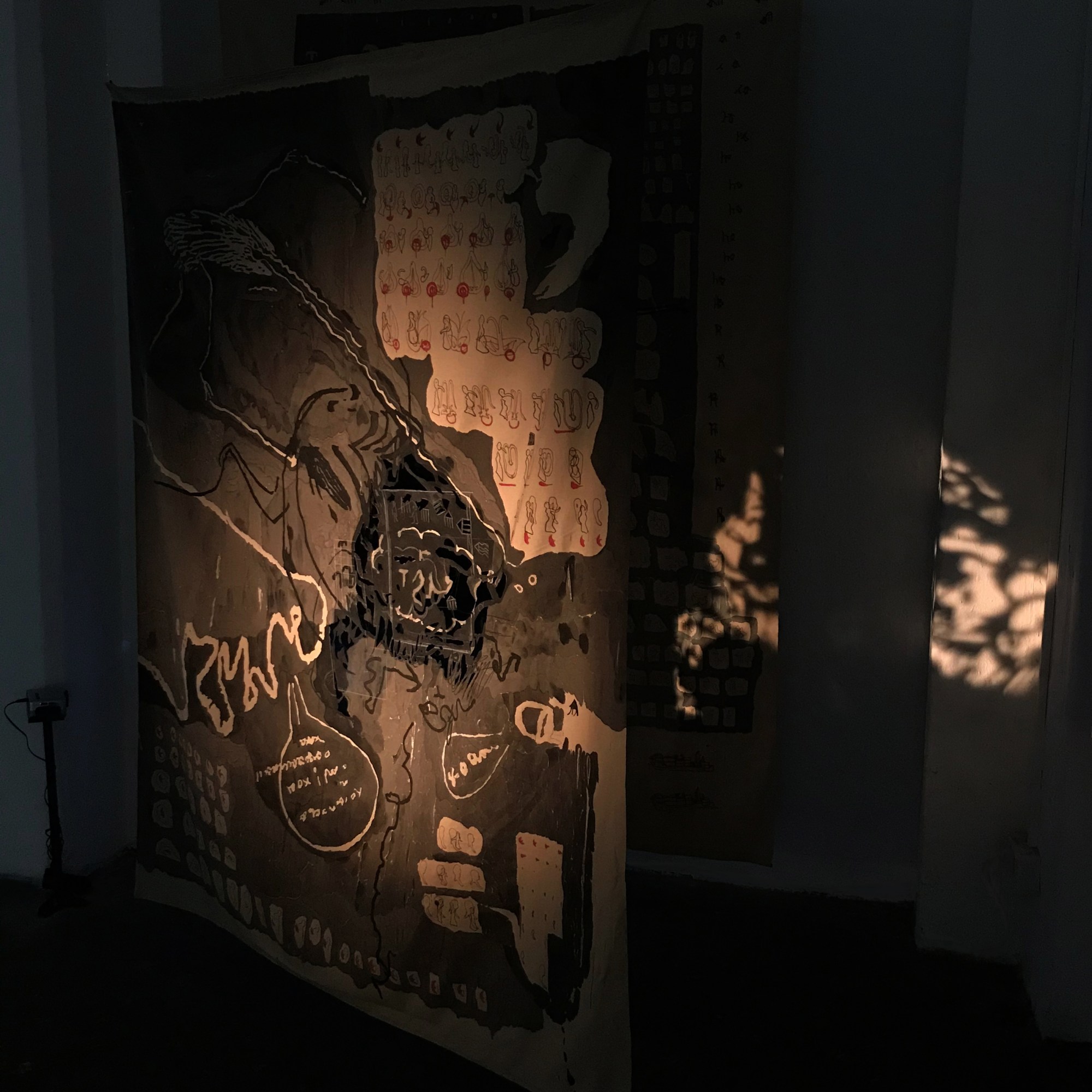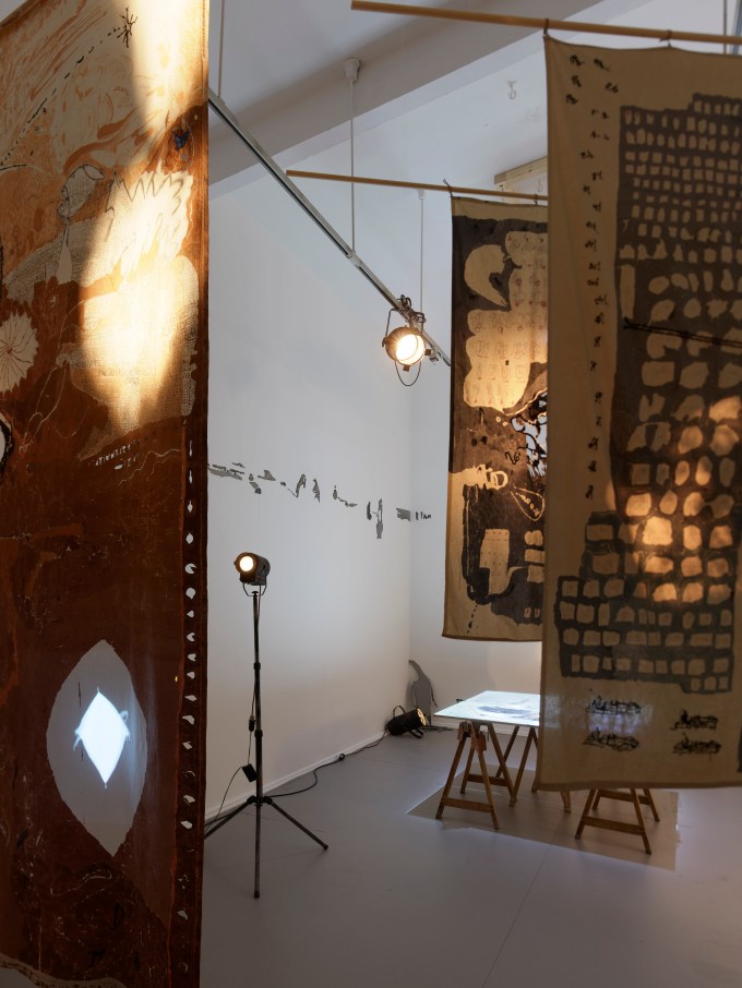 A Book Of Longing, view from the studio, Berlin, 2023, acrylic, marker, stitch and projection on fabric approx. 175cmx300cm and 170cmx250cm
