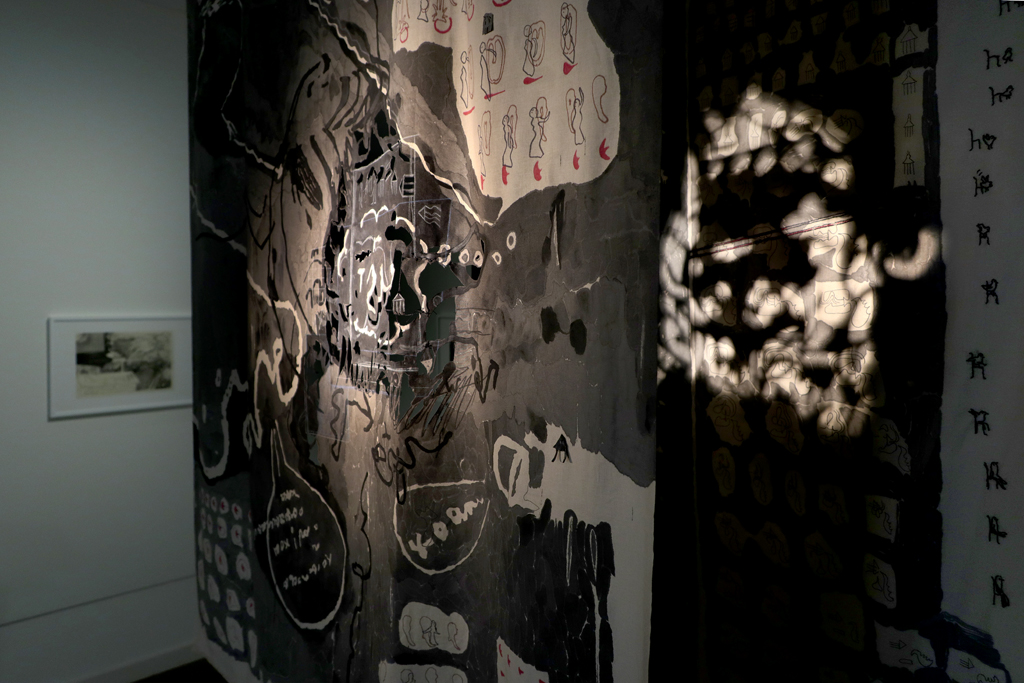 The Shy Installation, view from the Installation” Room Untitled“, Marker, acrylic, stitch, cutting and projection of animation loops 22” on fabric (174×134 cm and 208×134 cm), Kunstraum Kreuzberg/Bethanien, 2023,
